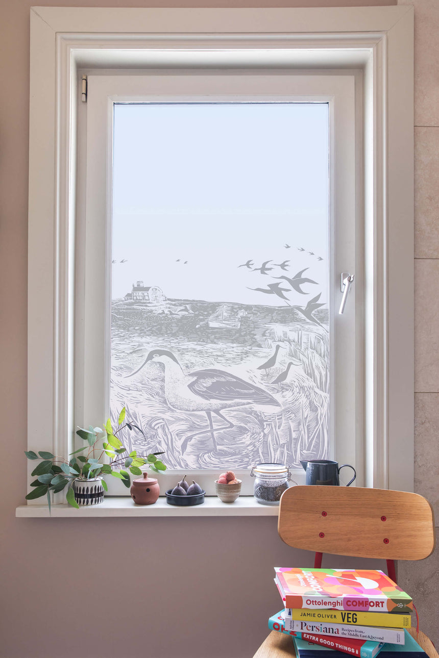 Featuring four of Angela’s much-loved prints — Avocets at Blakeney, Seal Song, Night Fox, and Blackbirds and Mulberry Tree — each design is beautifully reimagined as a softly translucent window film, printed on premium frosted material using eco-friendly inks.